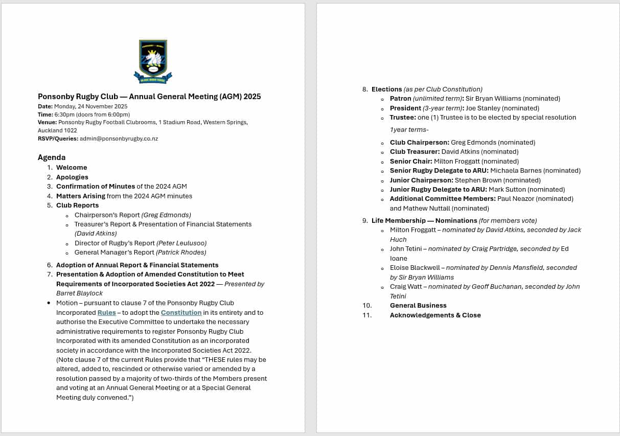 PONSONBY RUGBY CLUB'S ANNUAL GENERAL MEETING 2025